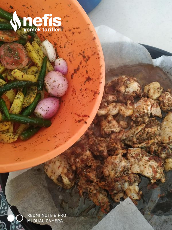 - Fırınımıza koyduğumuz tavuğumuzun üzerine harmanladığımız sebzemizi tavuklarımız pişmeden ek ediyoruz.