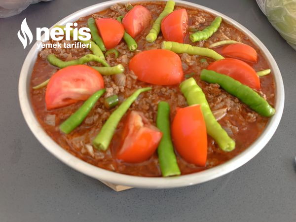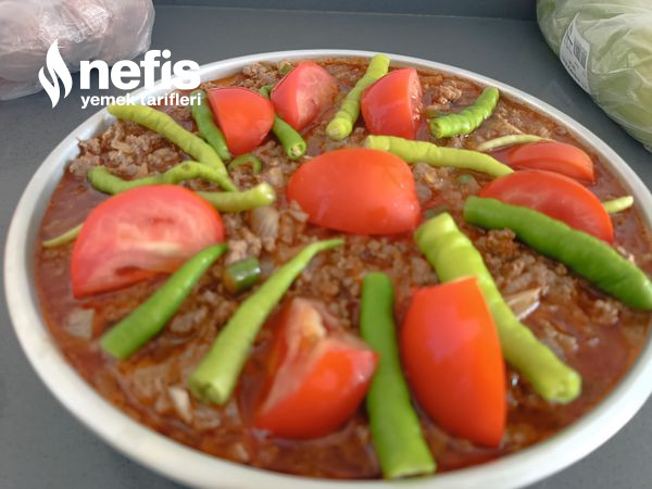 - Bir tava içerisine iki kaşık sıvı yağ koyup doğranmış soğan ve biberleri kavuralım daha sonra kıymayı ek edip suyunu çekene kadar kavurup doğranmış domates ve salçasını da ek edip çok az kavurun.