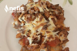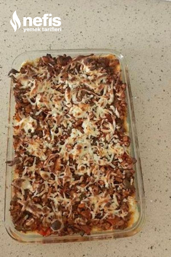 9. Borcamda ki pürenin üzerine bu karışımı yayıp kaşar serpip fırına atalım.