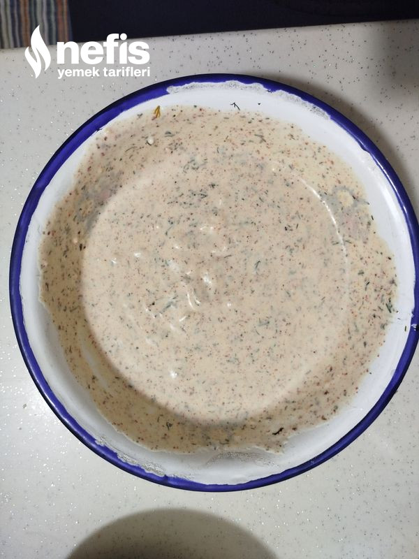 - Bir kaseye yoğurt, mayonez, zeytinyağı, sarımsak, kekik, tuz, pul biber, maydanoz ve dereotunu karıştırın maydanoz ve dereotu size kalmış istemezseniz koymayın.