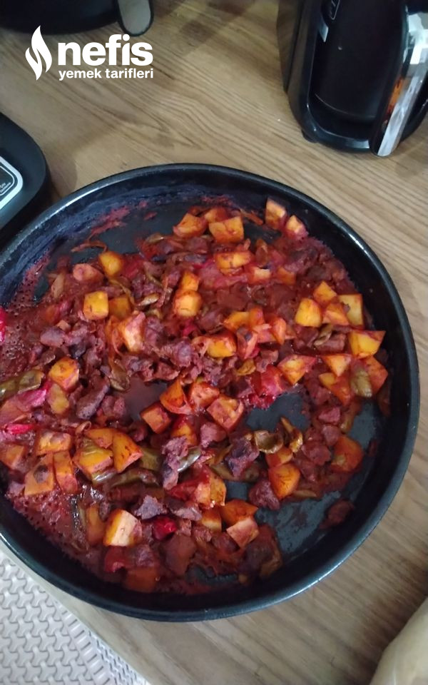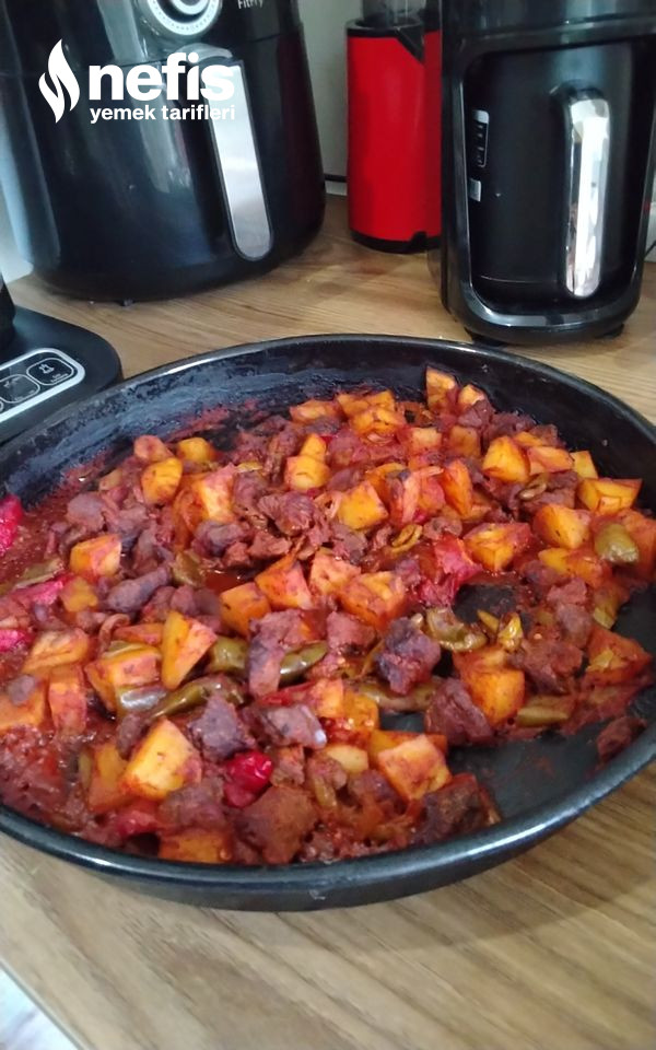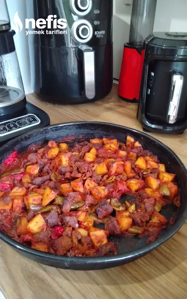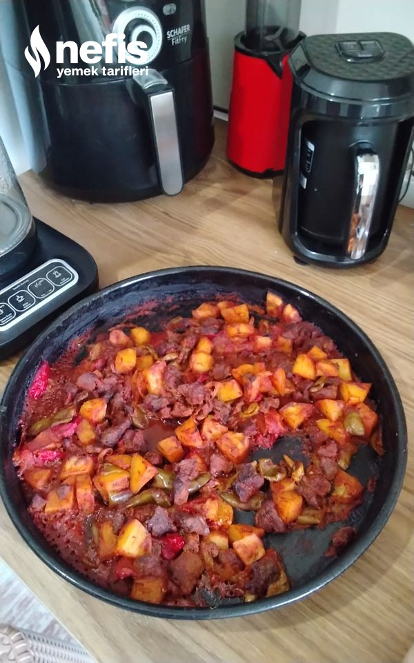 1. Bir tavada kuşbaşı etleri çekinceye suyunu salıp çekinceye kadar kavurun, patatesleri küp küp yeşil biber ve kapya biberi jülyen doğrayın.
