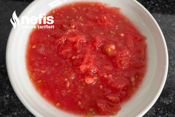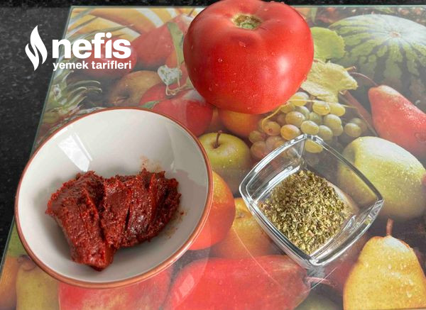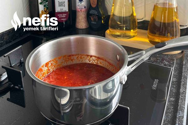 - Sosunu yapmak için kabımıza zeytin yağı, salçaları ve domatesi ekleyip kavuralım.