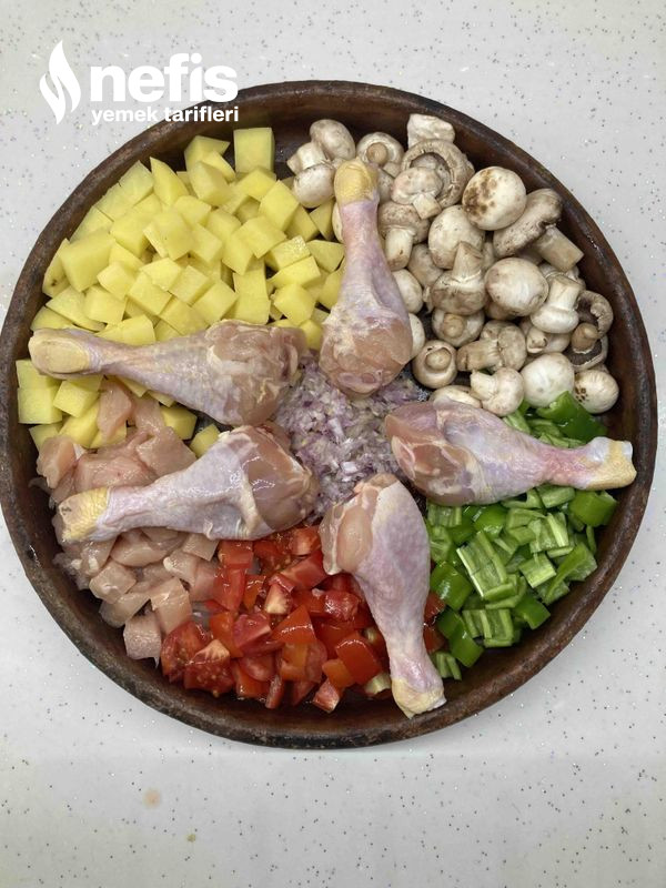 1. Tavuk göğsünü, patatesi, biberleri, domatesi, soğanı küp küp doğrayalım. Sarımsağı ezelim, mantarları yıkayalım tüm bırakalım.