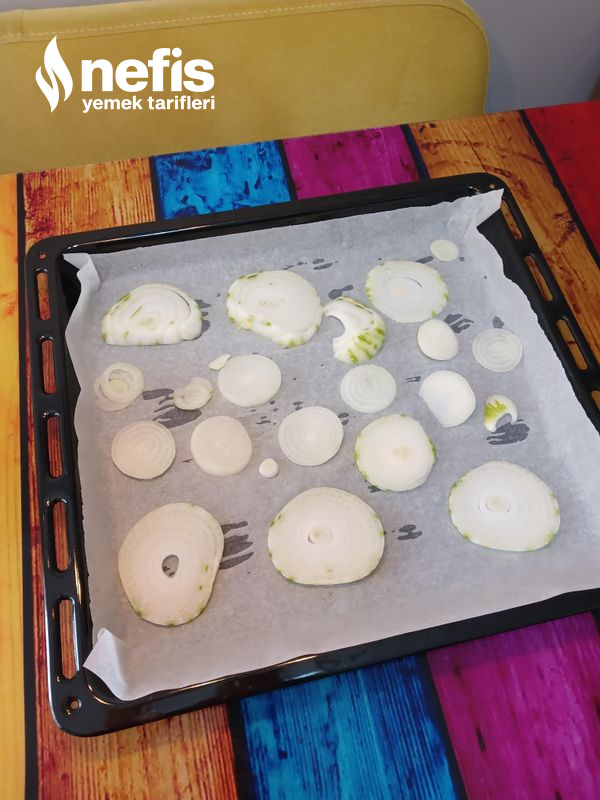 - 2 adet soğanı halka halka doğrayıp pişirme kağıdı serdiğimiz fırın tepsisine dizelim.