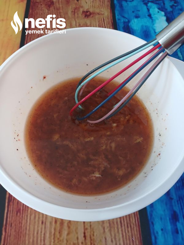 - Sosu için uygun bir kaba rendelenmiş sarımsak, rendelenmiş limon kabuğu, limon suyu, sıvı yağ, tuz, karabiber ve tozbiberi alıp karıştıralım.