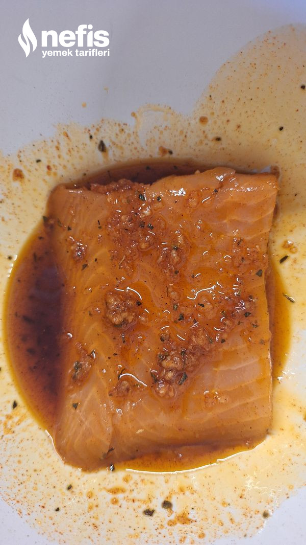 2. Geniş bir kapta zeytinyağı,sarımsak, tuz, karabiber, tatlı toz biber, limon suyu ve isteğe nazaran kekikle somonu soslayın.
