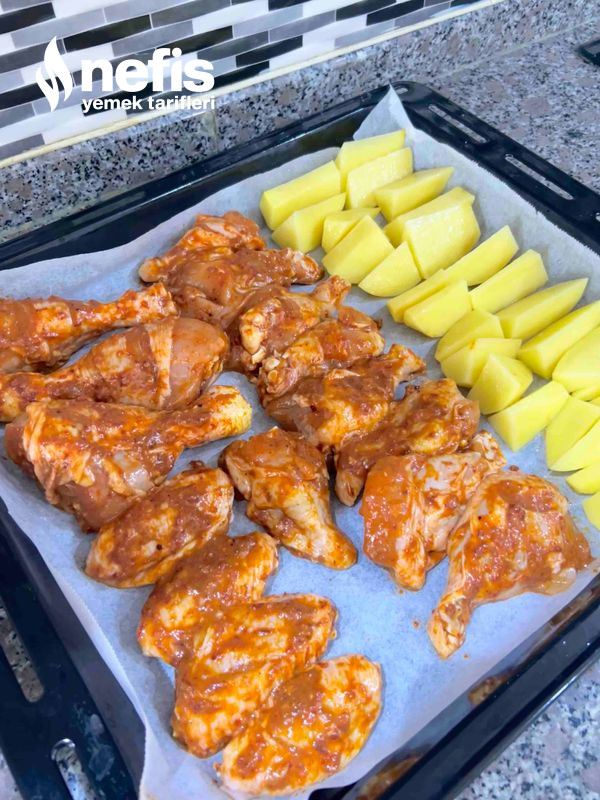 - Fırın tepsisine yağlı kağıt koyup bi tarafa patatesleri öbür tarafa tavukları sıralıyoruz.