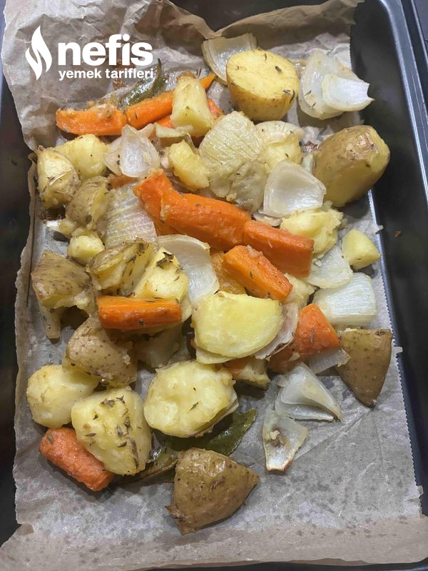 - Patates ve havuçları doğrayıp bir tencerede max 15 dk haşlayalım. Suyunu süzüp bir kaba alalım. İçine soğanları 4 e bölüp ekleyelim ve sosun içine kalan kekiği döküp karıştıralım. Fırın tepsisine yerleştirelim. 200 derece fırında 30 dk kadar pişirelim.