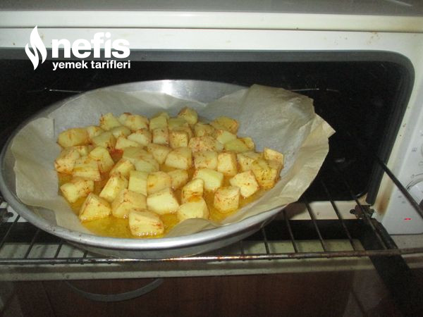 1. Patatesleri soyalım iri küp doğrayalım, beş dk soğuk suda bekletelim süzelim havlu kağıt ile biraz kurulayalım. Üzerine baharatları yağı karıştırıp gezdirelim. Yağlı kağıt serilmiş tepsiye dökelim.