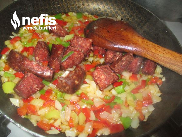 4. Sucuğun dış kabuğu soyup iri küp doğrayıp tavaya ekleyelim, tuz, baharat serpelim suyunu dökelim, fokurdayıncaya ocağın altını kısalım kısık ateşte denetim ederek suyunu çekene kadar pişirelim.