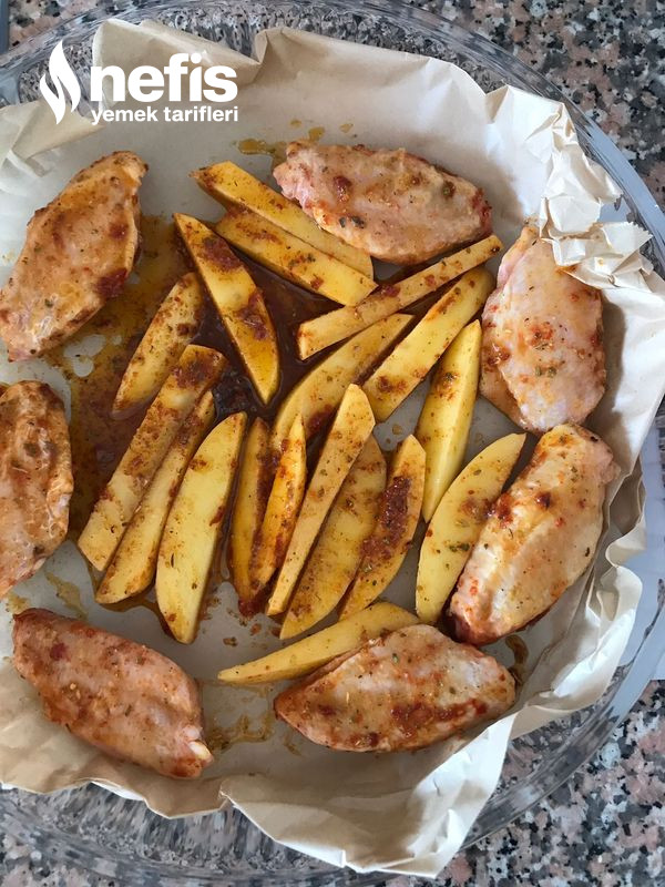 - Yaprak kanatları ve patatesi sosun içine atıp güzelce karıştırıyoruz yaklaşık 1 buçuk 2 saat boyunca buzdolabında bekletiyoruz.