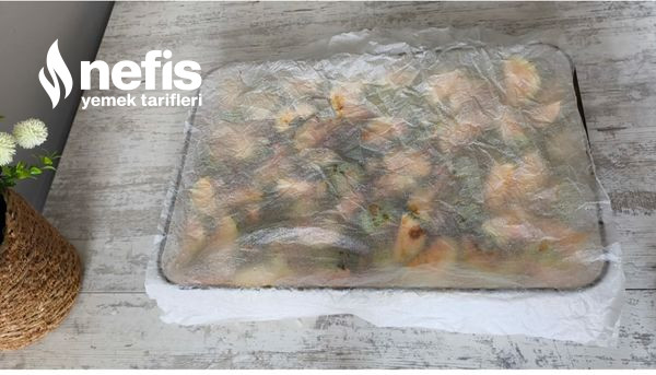- Üzeri sosunu döküp ıslatılmış fırın kağıdı ile kaplayalım.