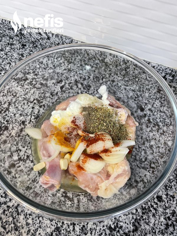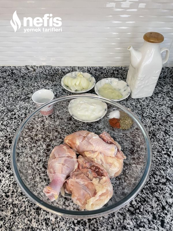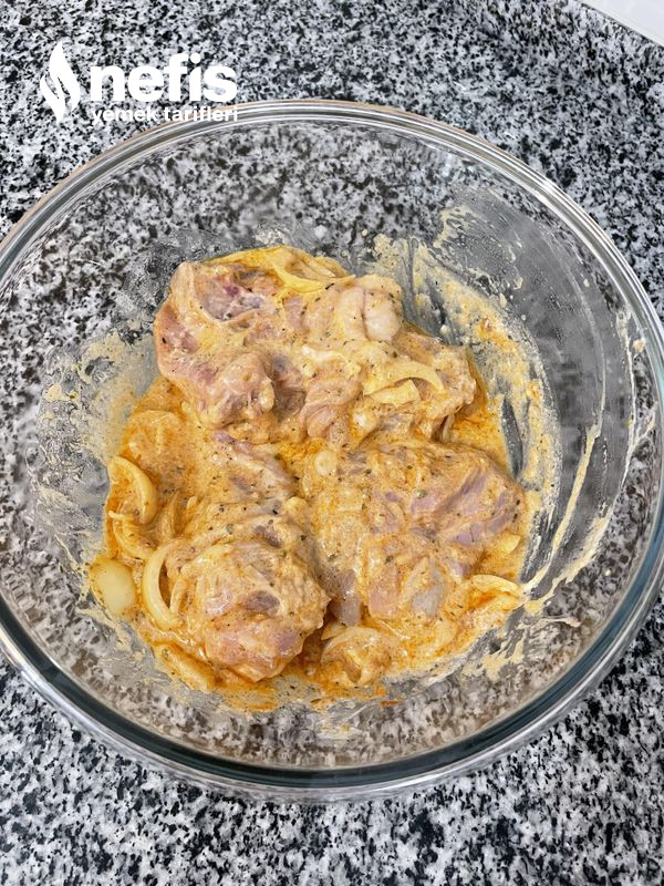 - Derin bir kaba yoğurt, zeytinyağı, rendelenmiş soğan, doğranmış soğan, sarımsak, su ve baharatları alıp karıştıralım. Daha sonra tavukları ekleyip, sosu tavuklara yedirelim. Kabımızın üzerine streç sinema ile kapatıp, dolapta en az bir saat bekletelim.