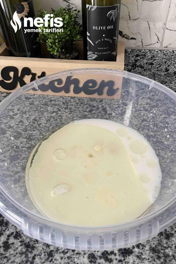 1. Ilık süt ve suyu ekliyoruz bir karıştırma fırçası ile karıştırıyoruz.