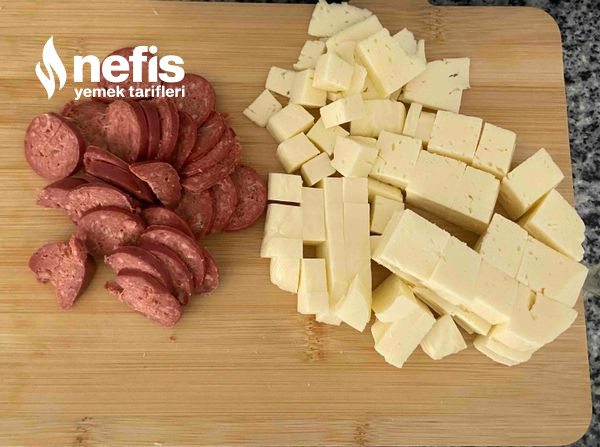 5. Şekillendirip, ortasına sucuk peynir koyup, üzerine susam döküyoruz.
