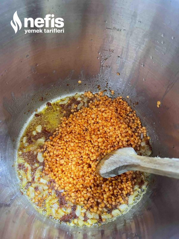 - Salçamızıda ekleyip kavurmaya devam ediyoruz, akabinde uygunca yıkanmış mercimekleri ilave edip karıştırıyoruz.