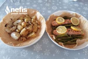 3. Dondurucudan çıkan somonlar az bir zeytinyağ ve tuz ile marine edilip, biberlerle birlikte airfry da 20-30 dakika 120 derecede, son 5 dakikası 180 derecede pişirilir. (somonlar dondurucudan çıkmamış taze ise, pişirme mühleti ona uygun ayarlanmalıdır).