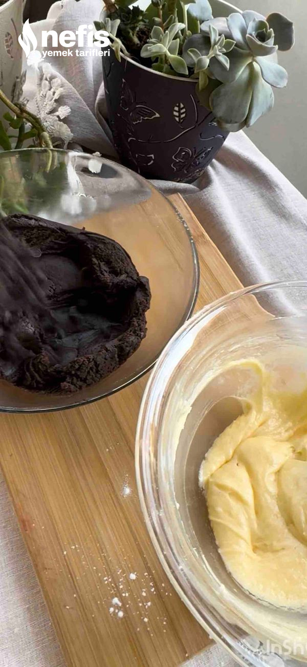 4. Sıvıyağın öteki yarısını ayırdığımız öteki karıştırma kabına aktaralım, kakao ve un ekleyerek yoğuralım son olarak damla çikolataları ekleyelim. 2. Karışım da hazır☺️.