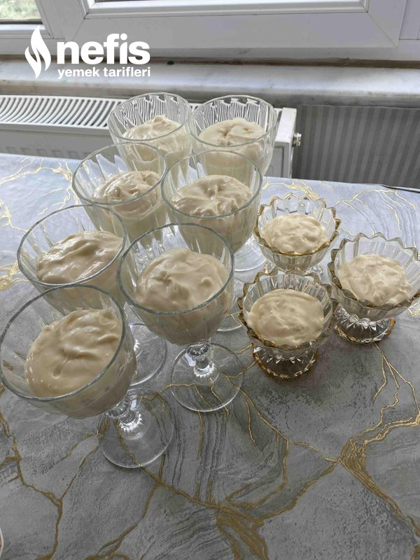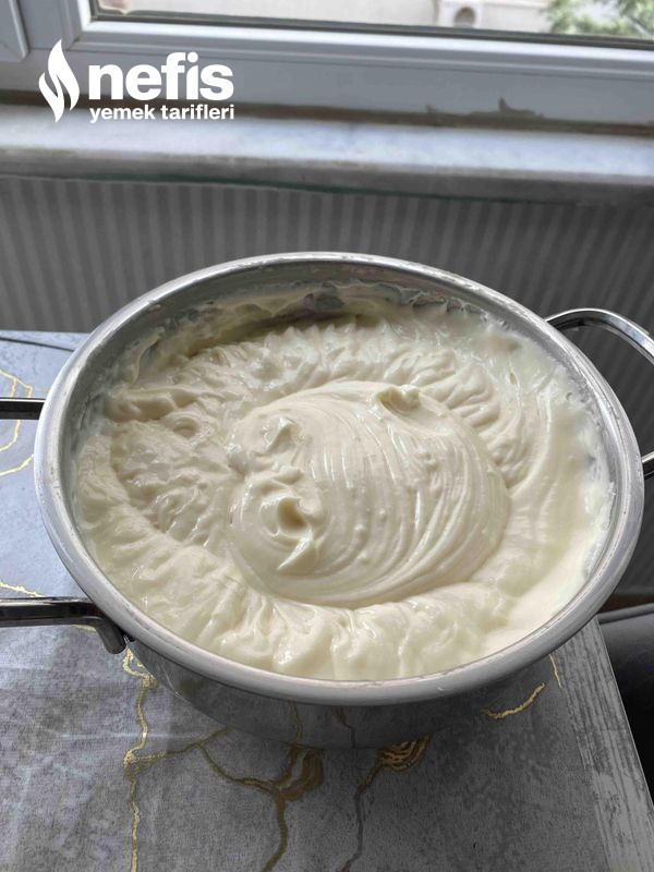 6. 1 bardak süt ve kremşantiyi düzgünce çırpıp soğuyan kremanın üzerine ekleyip karıştıralım.