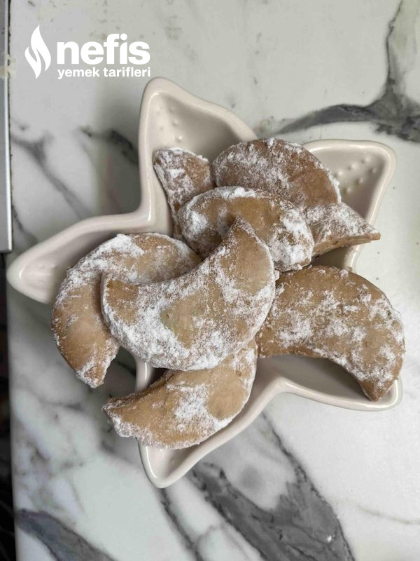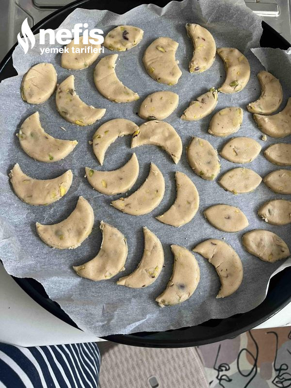 - Dinlendikten sonra iki yağlı kağıt ortasında hamur açılarak çay bardağı ile ay formu verilerek kesilen kurabiyeler fırın tepsisine dizilir.
