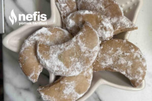 - Dinlendikten sonra iki yağlı kağıt ortasında hamur açılarak çay bardağı ile ay formu verilerek kesilen kurabiyeler fırın tepsisine dizilir.
