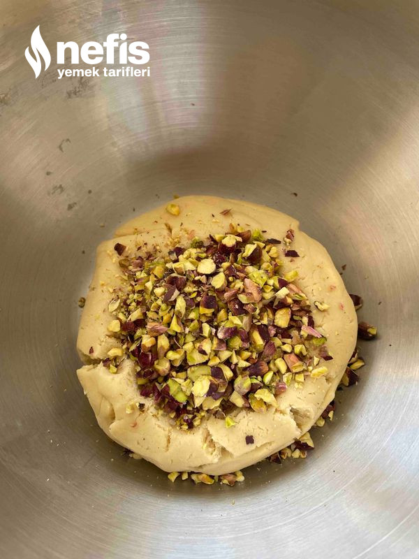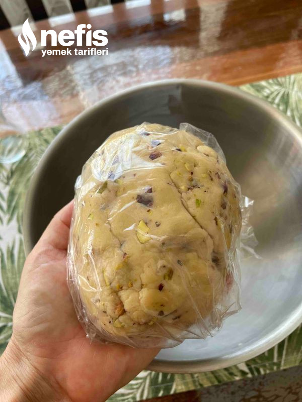 - Yumuşak ve pürüzsüz bir hamur elde edelim ,son olarak fıstığı ekleyip yoğuralım, hamurumuzu streç sinema ile sarıp buzdolabına kaldıralım 20-25 dk bekletelim.