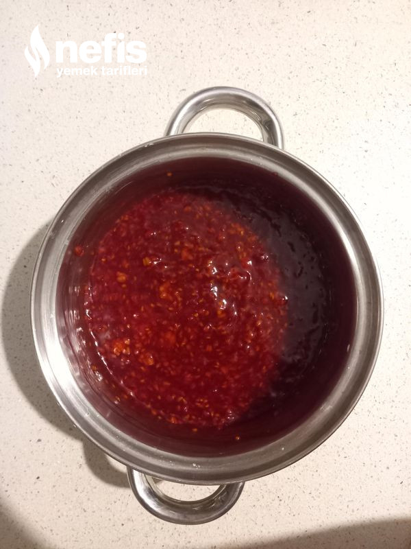 4. Frambuazlı sos için bütün gereçleri karıştırıp kaynayana kadar pişirelim. Sonrasında soğumaya bırakalım.