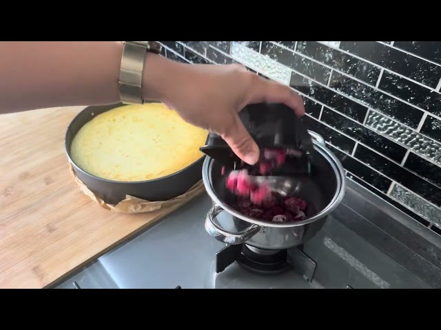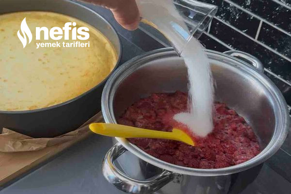 9. Kek soğurken sosunu pişirelim. Frambuaz ve suyu tencereye alıp kaynamaya başlayınca şekerini ilave edelim.