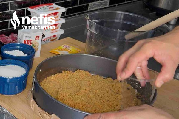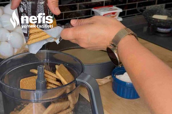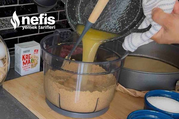 1. Bisküvileri robottan çekelim üzerine eritilmiş tereyağını ekleyip karıştıralım ve yağlı kağıt serili kelepçeli kalıp tabanına serelim, bardak yardımıyla düzeltip dolaba kaldıralım.