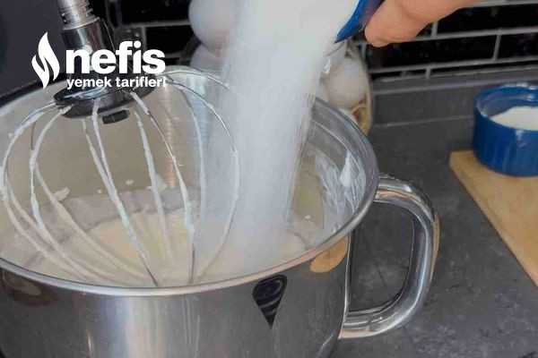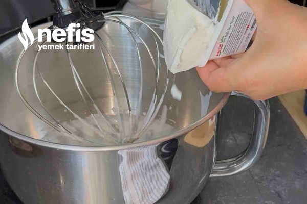3. Üzerine labne ekleyip 5 dakika daha çırpalım, daha sonra şekerini ilave edip şeker eriyene kadar çırpmaya devam edelim.