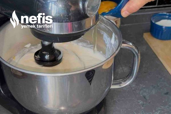 5. Son olarak katı materyallere geçelim un vanilya ve nişastayı da ekleyip pürüzsüz bir kıvam alana kadar çırpalım.