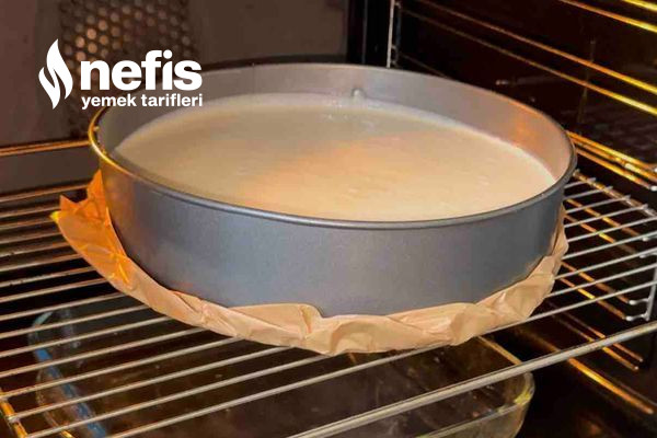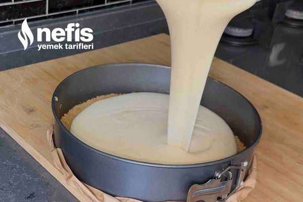 6. Dolaptan çıkarttığımız bisküvi tabanının üzerine kremayı dökelim tezgaha birkaç sefer vurup havasını alıp 150 derecelik hafif ılık fırına koyalım.