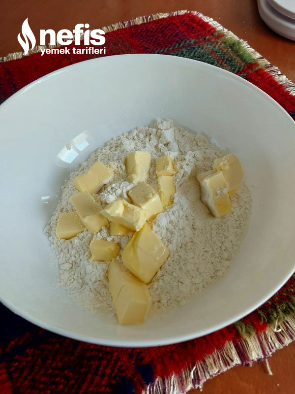 - Soğuk tereyağını ekleyip parmak uçlarınızla unlu karışımın içine yedirin.