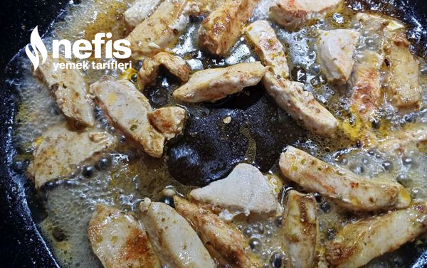 - Öncelikle tavuğu küçük küçük kestim hafif yağlı tavada kavurmaya başladım.