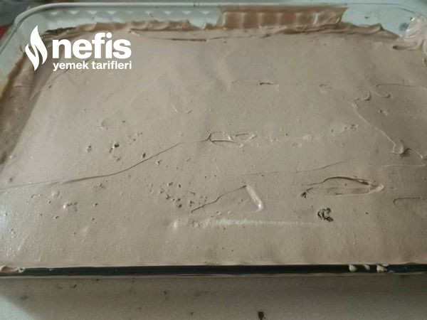 5. Bir kaba 2 paket krem şanti ve bir buçuk su bardağı soğuk sütü ekleyip çırpın ,ondan sonra üzerine 3 yemek kaşığı labne peyniri ve 3 yemek kaşığı çikolata ekleyip çırpmaya devam edin.Dolaba dinlendirmeye bırakın.