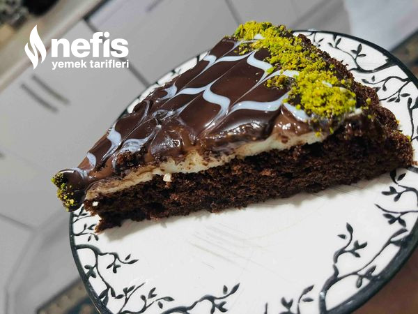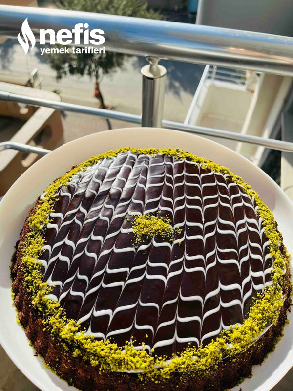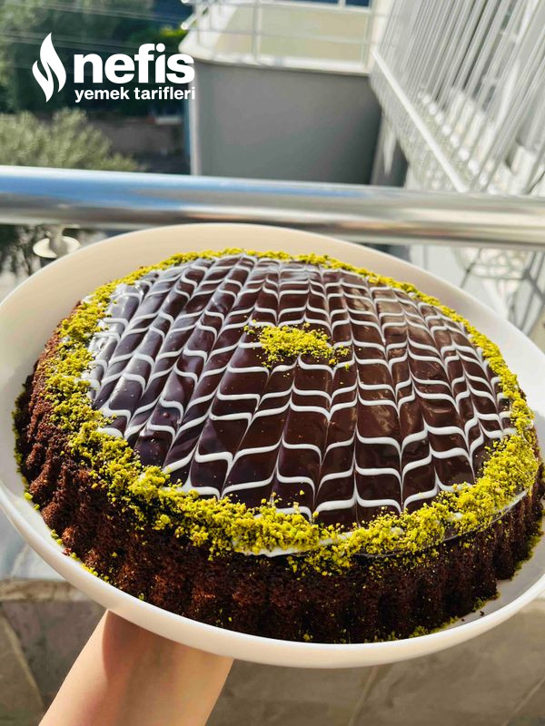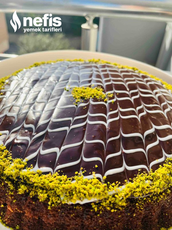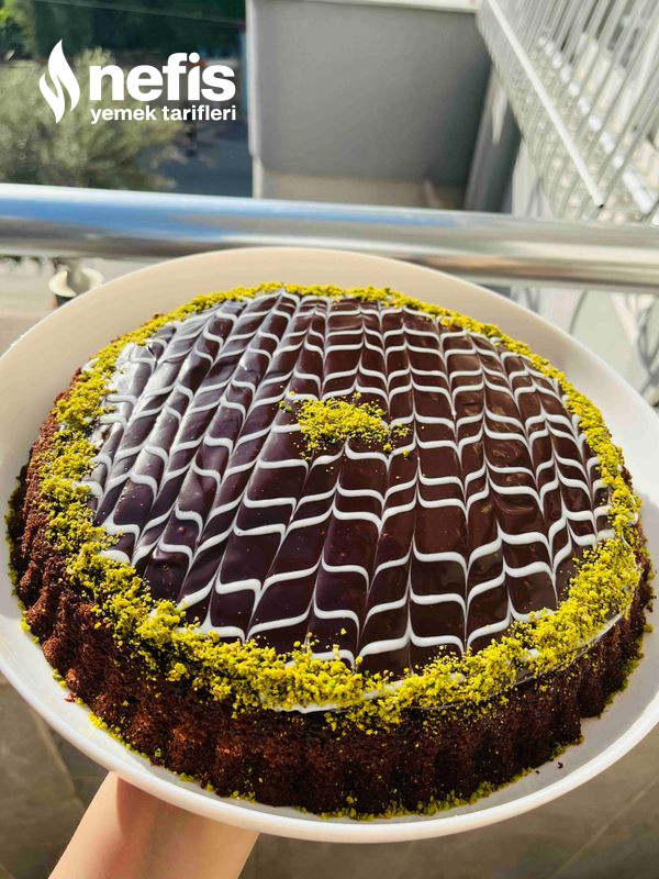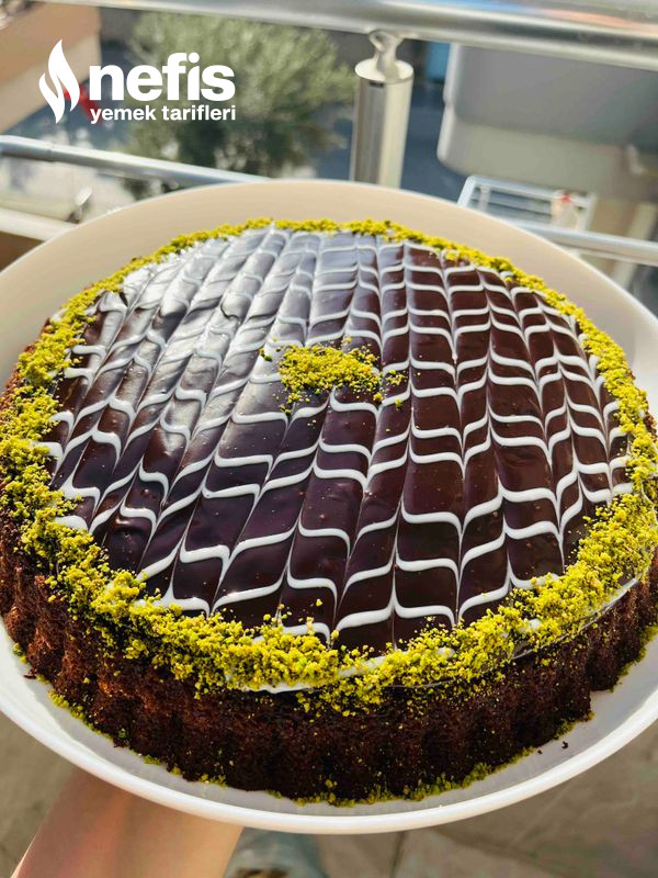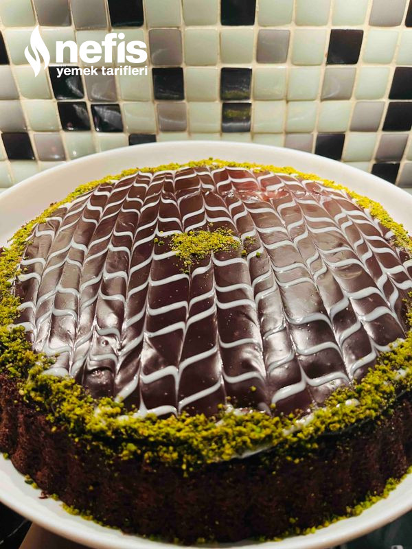 - Pişen keke krema koyulur yapılan ganaj da kremanın üzerine gezdirilir toz antep ile süslenir.