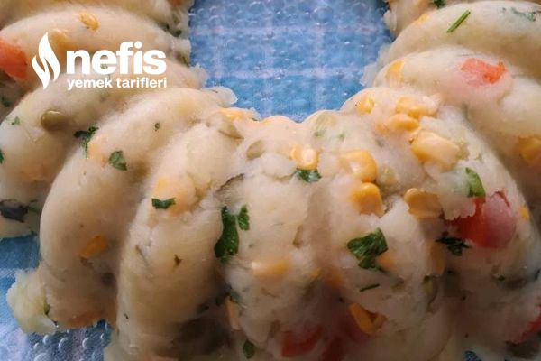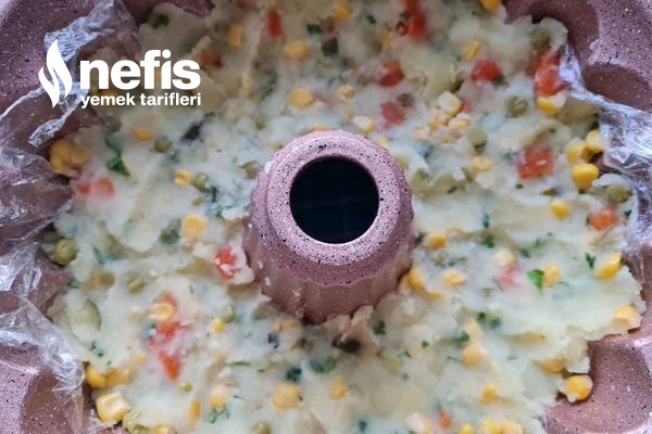 - Doğranmış kornişon salatalık,mısır,garnitür ve maydanoz ek edilir,karıştırılarak streçlenmiş kalıba salata bastırılarak yayılır.