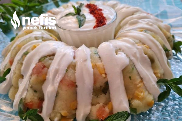 - Kalıpta donmuş olan salata uygun bir servis tabağına aksi çevrilerek aktarılır, üzerine yoğurt yayılır.