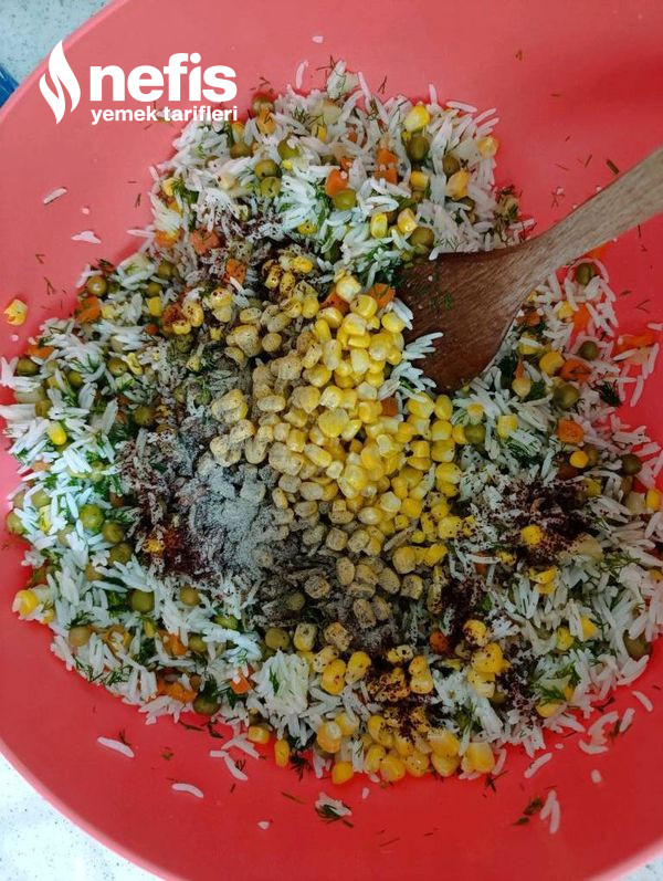 5. Soğuyan pilav büyük kaba alınır ve öteki gereçlerle karıştırılır.