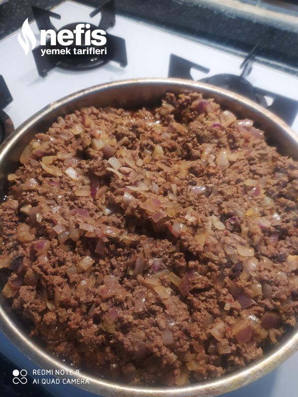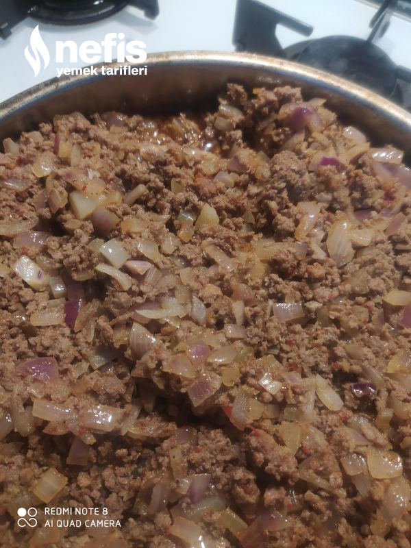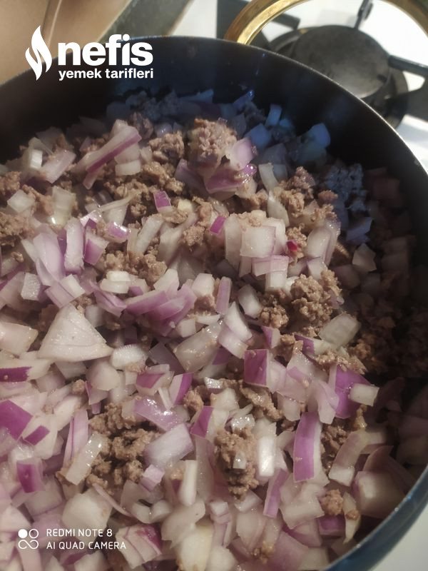 - İlk olarak kıymayı kavuralım, daha sonra soğanları ekleyelim ,soğanlar biraz sulanınca salçayı, karabiberi ekleyelim .