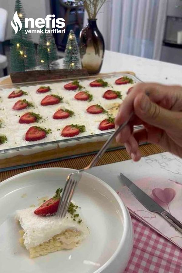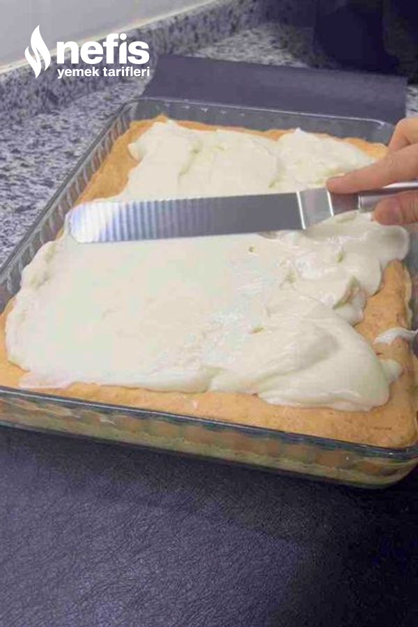 9. Soğuyan kekimizi süt ile kremayı çırptıktan sonra güzelce her yeri ıslanacak formda dökelim.