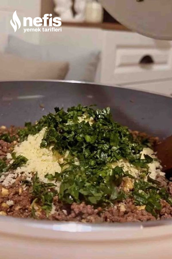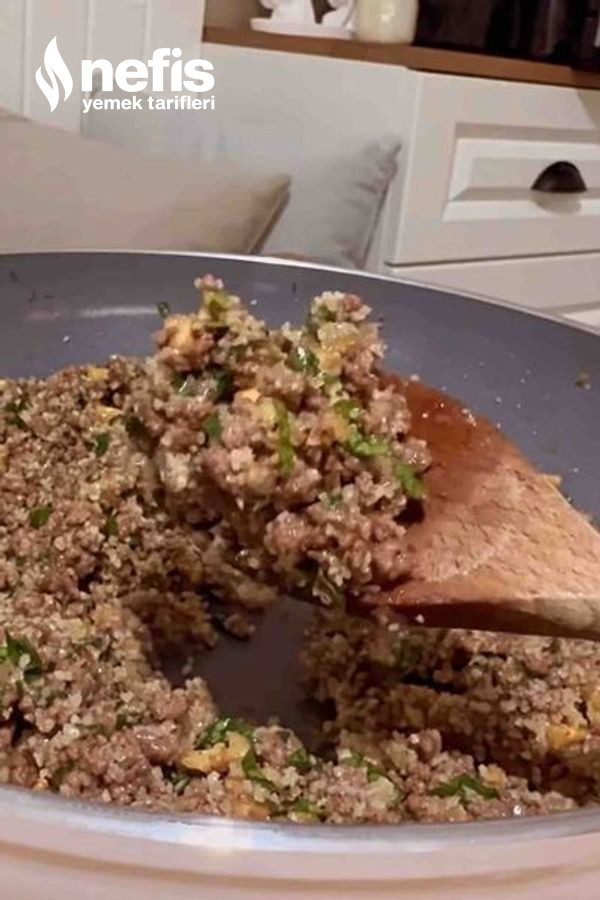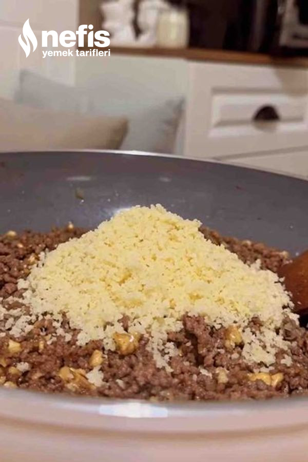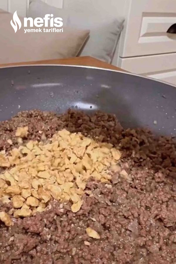 2. Tavaya aldığımız sıvı yağını ısıtalım küçük küçük doğradığımız kuru soğanları ek edelim birkaç dakika kavurduktan sonra kıymayı ek edip orta ara karıştırarak pişirelim doğranmış ceviz tuz, baharatlar ve bulguru ek edelim ocağın altını kapatalım.