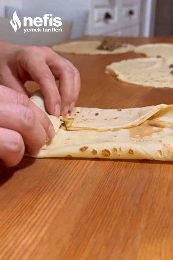 4. Krepleri mümkün olduğunca ince dökerek pişirelim krepleri iç harcımız ile tek tek dolduralım biraz sıkı olacak biçimde saralım.