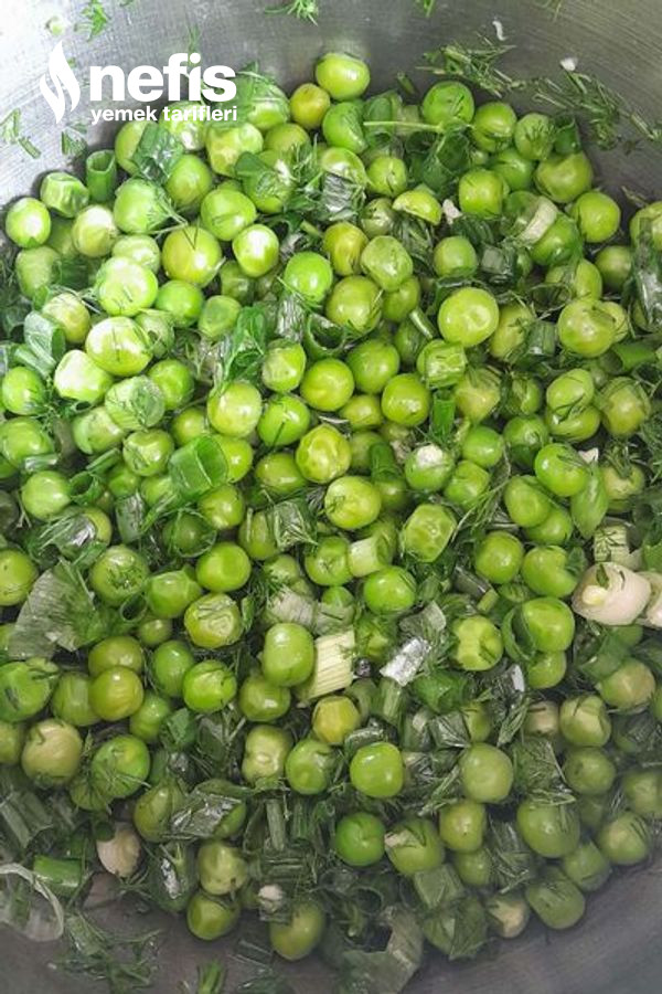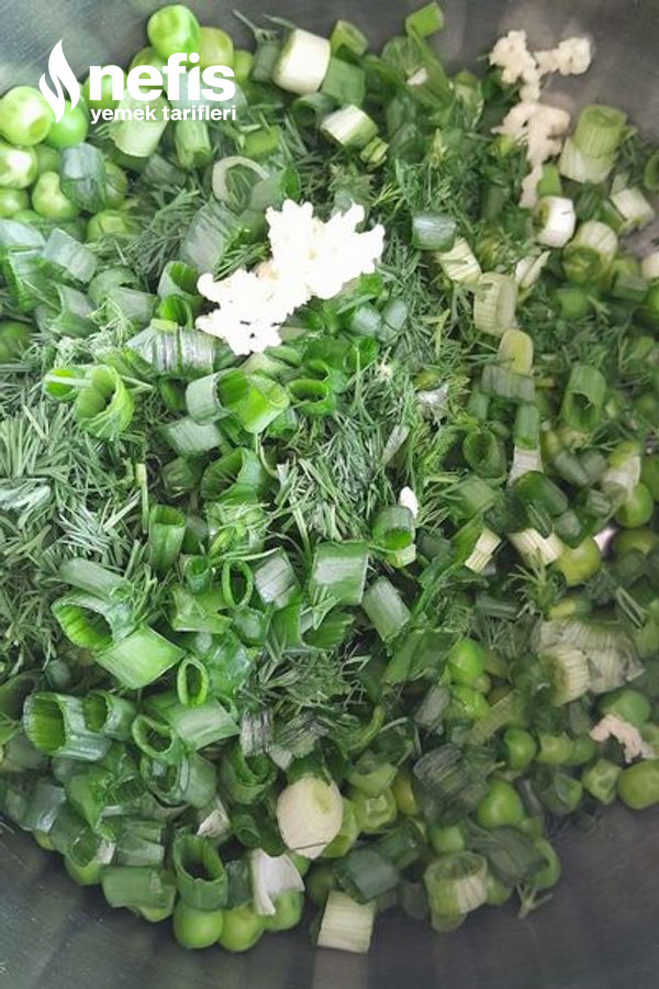 2. Bezelyeler haşlanana kadar dereotu ve yeşilsoğanı doğrayın. Haşlanan bezelyeleri süzün.