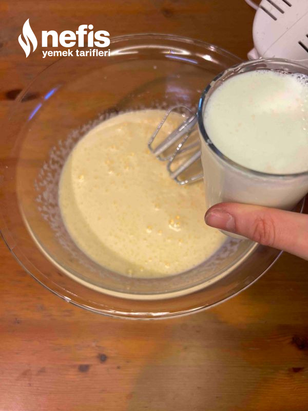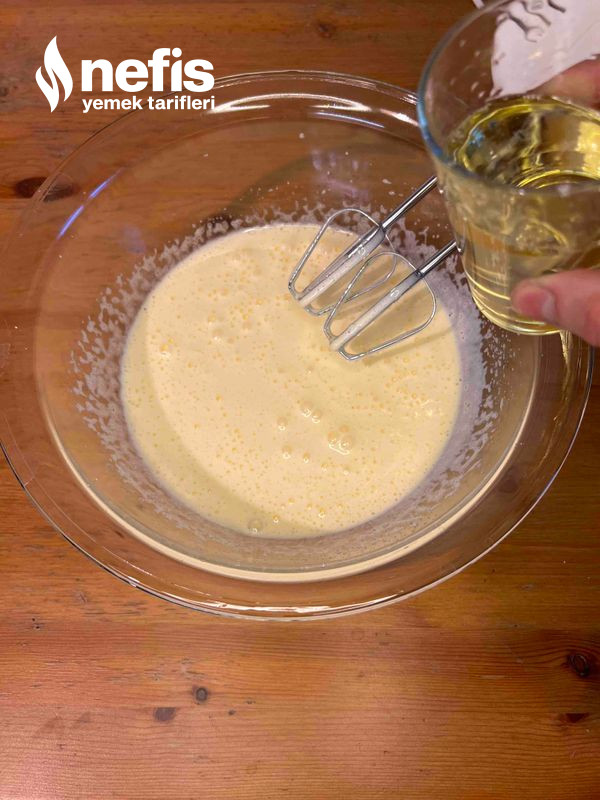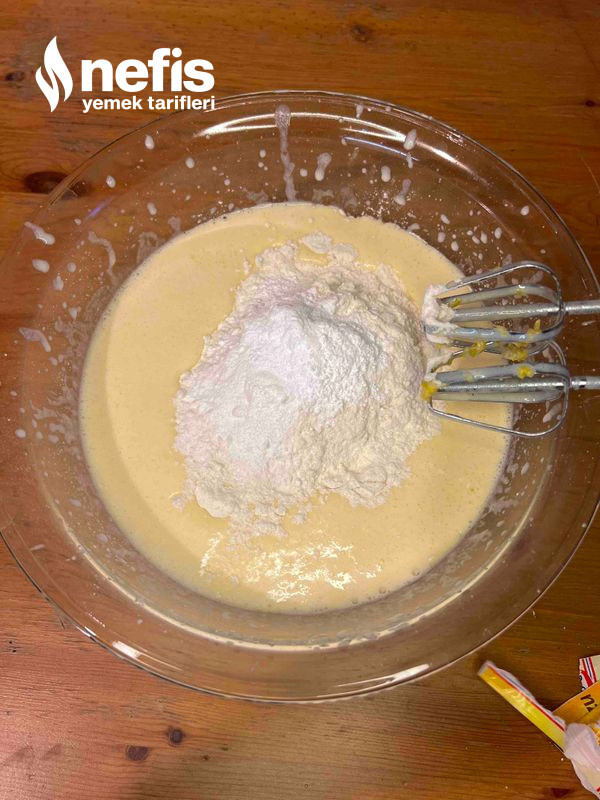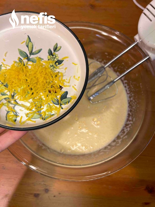 1. Yumurta ve şekeri bembeyaz olana kadar güzelce çırpıyoruz. Üzerine süt, sıvı yağ, limon suyu ve limon kabuklarını da ekleyip tekrar çırpıyoruz.