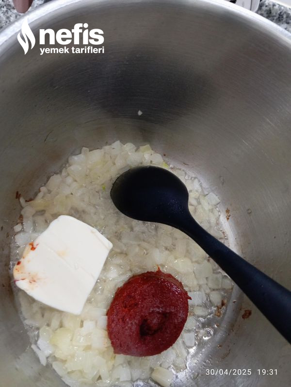 - Yemeklik doğradığımız soğanı kokusu çıkıncaya kadar sıvı yağda kavuralım. (kavurma sürecini kısık ateşte yapalım) salçayı ve tereyağını ekleyip kavurmaya devam edelim.