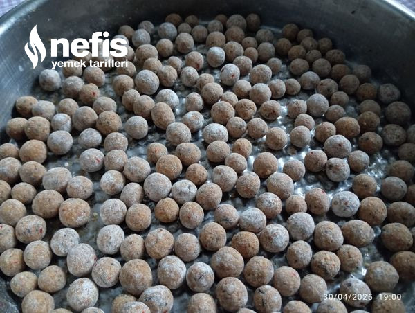 - Yuvarladığımız köfteleri un serptiğimiz tepsiye dizelim. Köfteler bittikten sonra yemeğin suyunu hazırlama basamağına geçebiliriz.