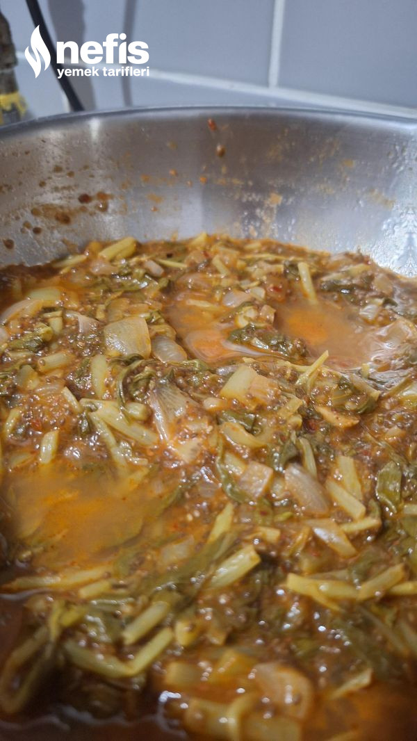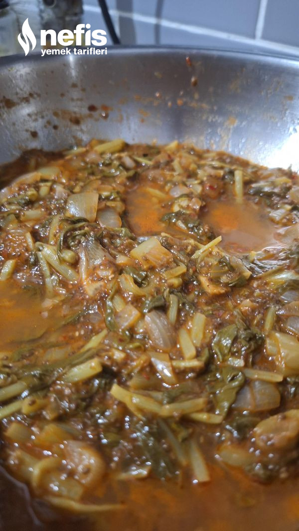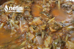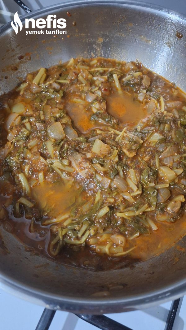 - Soğanı ve biberi doğrayıp yağda kavurmaya başlayın. Kavrulunca salçayı ekleyin. Sonra semizotunu ekleyin.