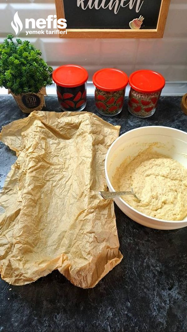 - Yumurta ve yoğurdu çırp. Yulaf ununu, tuz, kabartma tozunu ek edip karıştır. Islatıp buruşturduğun yağlı kağıdı kalıbının tabanına ser. Hamuru üzerine döküp yay.