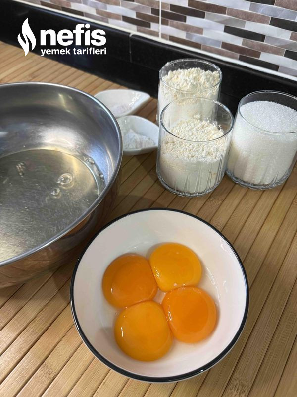 - Pandispanya ile başlıyoruz. Yumurtanın beyazı ve sarısını ayırın. Beyazları bir tutam tuz ve şekerin yarısıyla düzgünce çırpın. Farklı bir kapta yumurta sarılarını kalan şekerle çırpın, rengi açılınca sıcak suyu ekleyin.